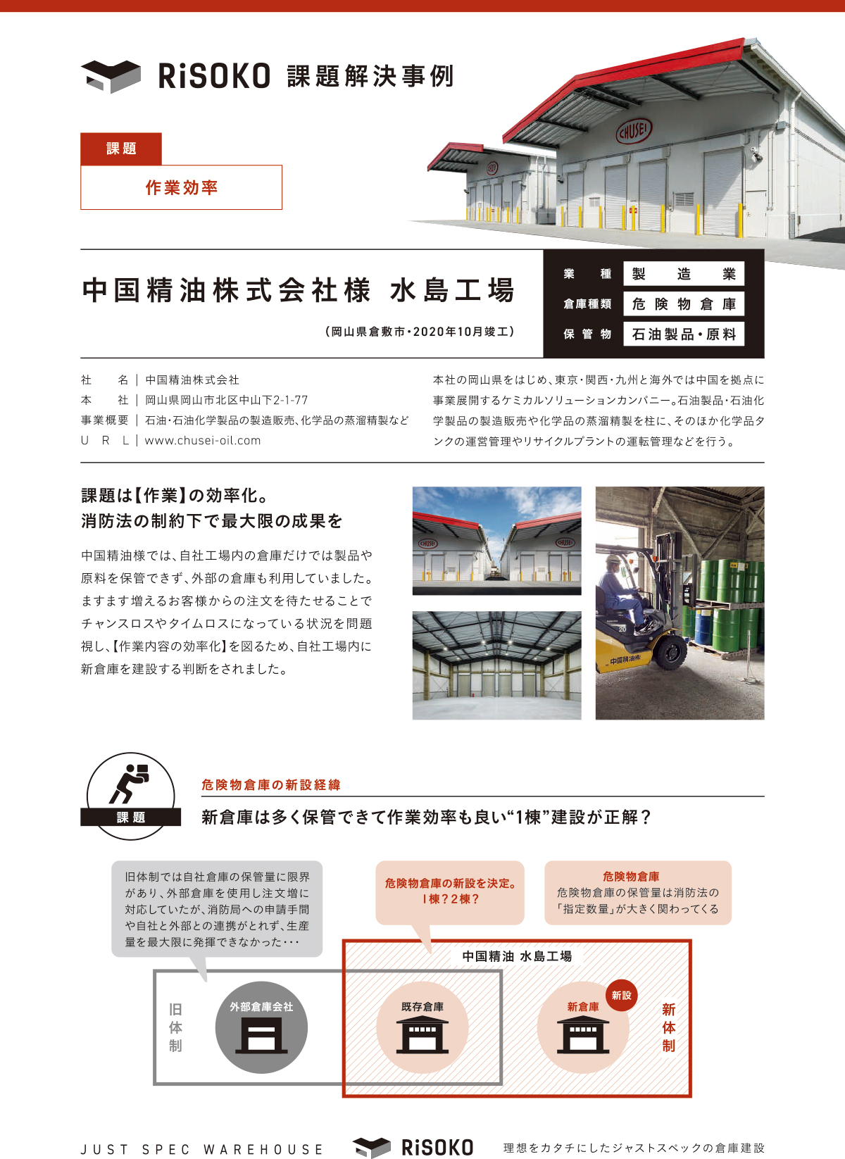 中国精油様では、自社工場内の倉庫だけでは製品や原料を保管できず、外部の倉庫も利用していました。ますます増えるお客様からの注文を待たせることでチャンスロスやタイムロスになっている状況を問題視し、【保管量の効率化】を図るため、自社工場内に新倉庫を建設する判断をされました。