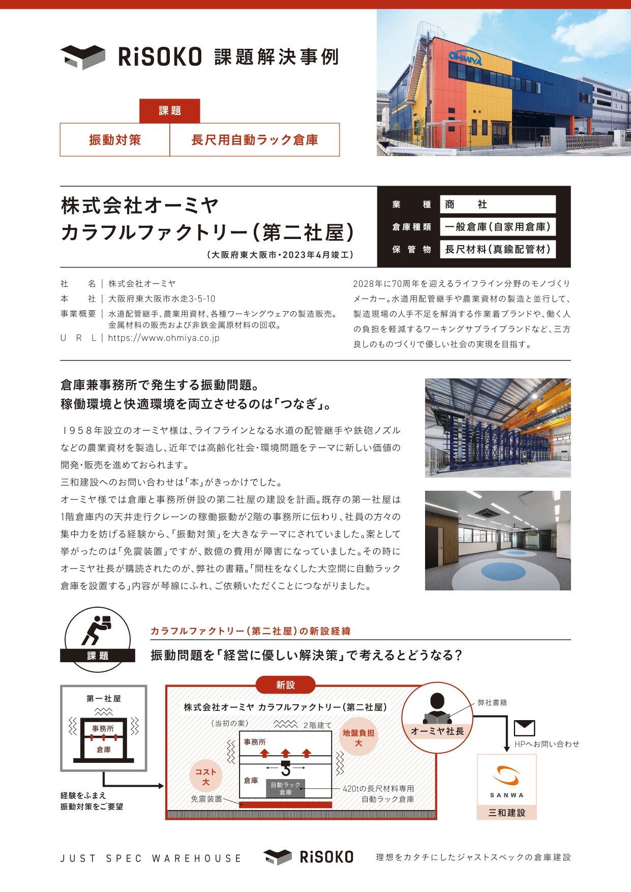 オーミヤ様では倉庫と事務所併設の第二社屋の建設を計画。既存の第一社屋は1階倉庫内の天井走行クレーンの稼働動力が2階の事務所に伝わり、社員の方々の集中力を妨げる課題から、「振動対策」を大きなテーマにしていました。