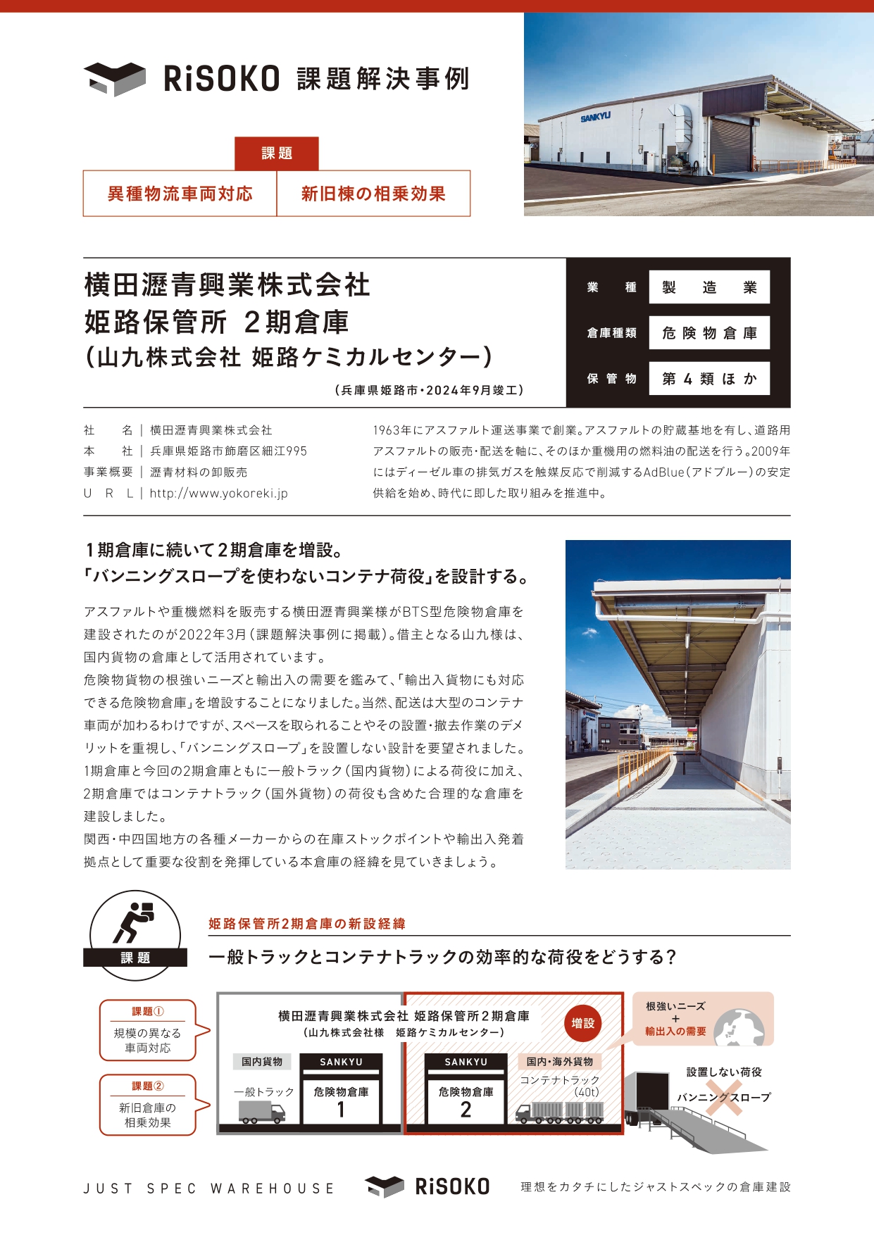 アスファルトや道路建材を販売する横田瀝青興業株式会社がBTS型危険物倉庫を建設されたのが2022年3月(姫路保管所1期)。倉庫はすでに順調に稼働しており、国内貨物の倉庫として活用されています。