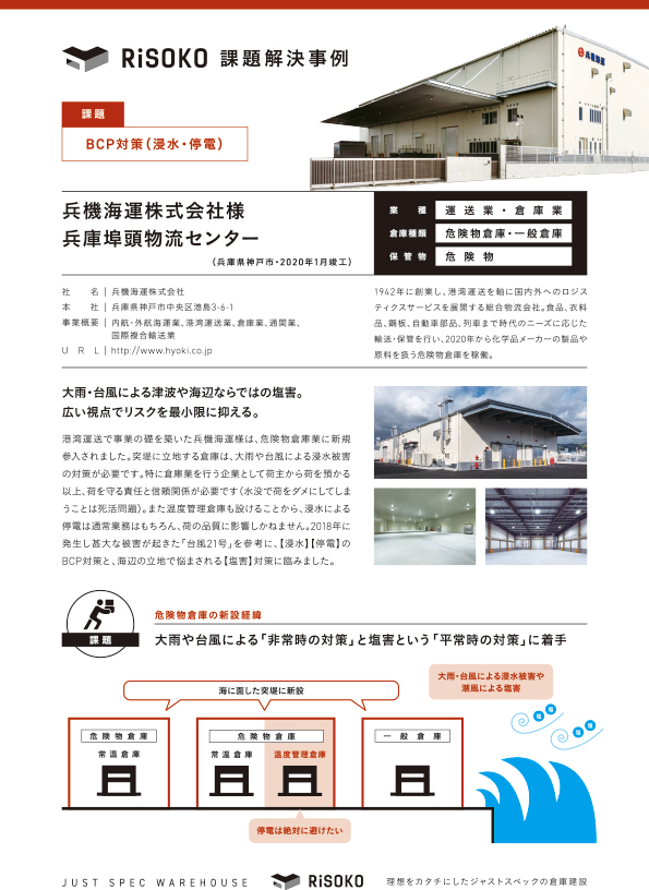 港湾運送で事業の礎を築いた兵機海運様は、危険物倉庫業に新規参入されました。突堤に立地する倉庫は、大雨や台風による浸水被害の対策が必要です。特に倉庫業を行う企業として荷主から荷を預かる以上、荷を守る責任と信頼関係が必要です(水没で荷をダメにしてしまうことは死活問題)。また温度管理倉庫も設けることから、浸水による停電は通常業務はもちろん、荷の品質に影響しかねません。2018年に発生し甚大な被害が起きた「台風21号」を参考に、【浸水】【停電】のBCP対策と、海辺の立地で悩まされる【塩害】対策に臨みました。