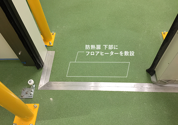 冷凍冷蔵庫の前の通路・荷捌き場は、冷凍庫内とつながった床が冷やされて結露が発生しやすくなります。 そこで冷凍庫前の床には施工段階でフロアヒーターを敷設します。