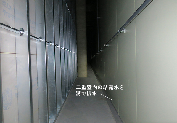 冷凍冷蔵庫が建物の外部に接する場合、ALC等の外壁材の内側に断熱パネルを設置することで壁が二重になるケースがあります。このようなケースでは、二重壁内の空間の空気が滞留し結露しやすい状態になります。よって、結露が発生すことを前提に二重壁内の床面に排水溝を設けて結露水を外部に排出するディテールを採用します。