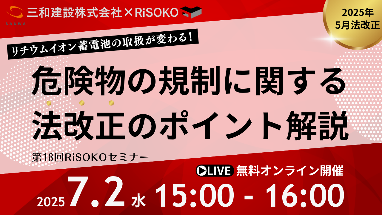 今回は前回に引き続き、2025年7月2日に行ったRiSOKOセミナー『消防法改正解説セミナー危険物の規制に関する法改正のポイント解説』について、お時間の関係などでセミナーに参加できなかった方のため、内容を要約してご紹介したいと思います。